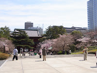 This morning I met up with Mom and Dad and we headed to Shiba Park. One of the main reasons for their visit during this time of year is to see the cherry blossoms. It's been a little colder recently so the flowers haven't fully bloomed yet, but some of the trees already have. Some people had blue tarps set up and were doing "hanami" which is flower viewing. This is a tradition in Japan in which people go and sit under the cherry blossoms and eat and drink while enjoying the view of the flowers.